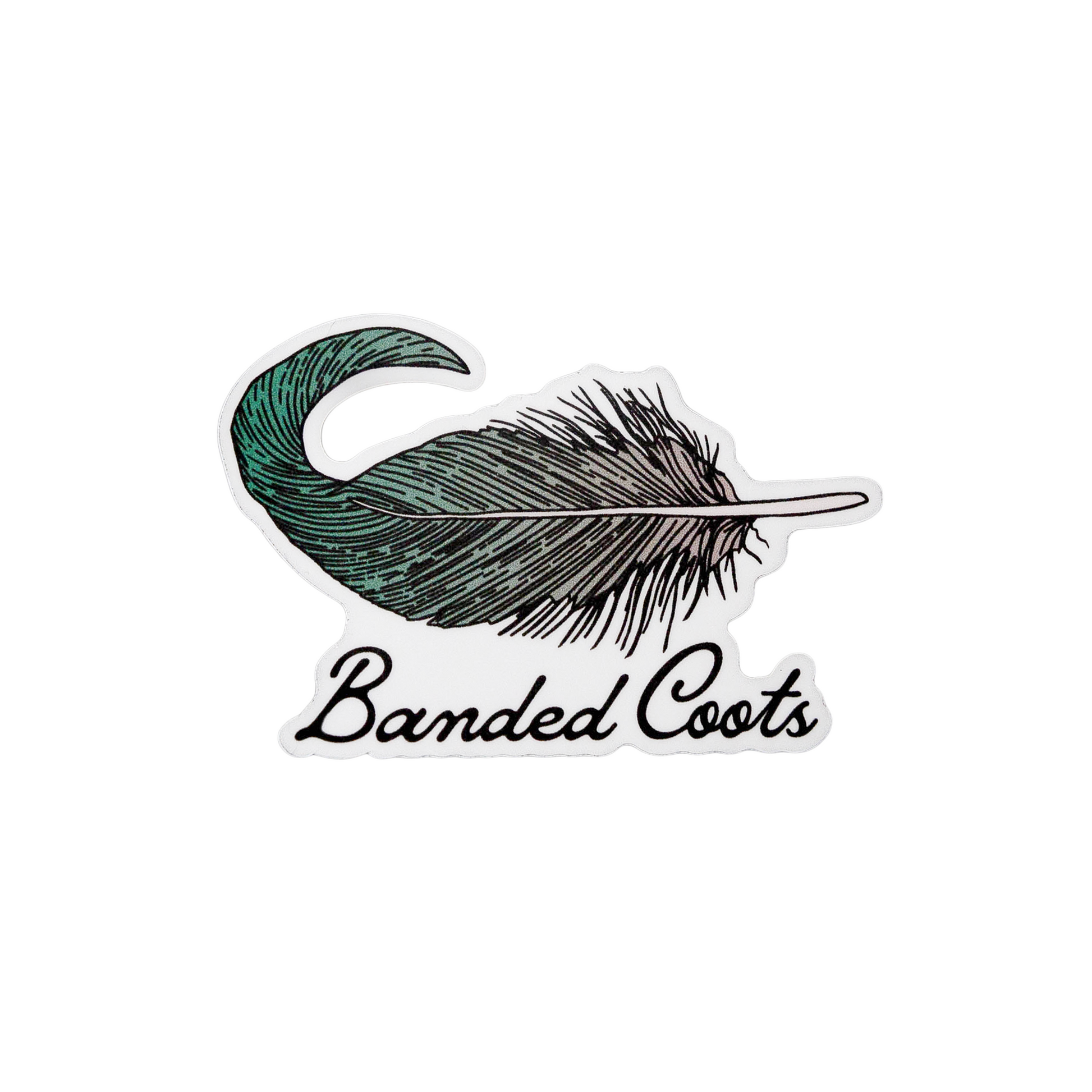 Introducing our new Banded Coots sticker, featuring a striking graphic of a green feather and the text "Banded Coots". This sticker is perfect for those who appreciate the beauty and mystery of nature, and who want to show off their love for the outdoors.